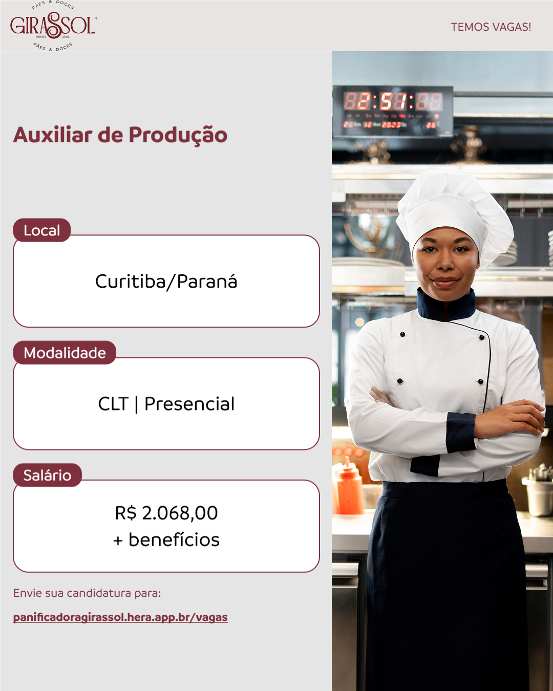 O Auxiliar de Produção será responsável por apoiar as atividades operacionais da equipe, garantindo a eficiência e a qualidade dos processos produtivos. As principais responsabilidades incluem a organização do ambiente de trabalho, a execução de tarefas de montagem e embalagem dos produtos ( encomendas). Será responsável também por produzir produtos de panificação tais como: cueca virada, rosca, lua mel, pão do céu, carolinas, recheios e produtos afins e demais atividades inerentes à função.